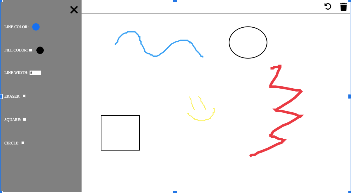 Una volta impaginato il tutto abbiamo una barra degli strumenti nella quale scegliere colore, dimensione e forme da realizzare, in alto a destra abbiamo un icona del cestino che per resettare la pagina semplicemente esegue un refresh della stessa, mentre accanto il tasto “torna indietro” va a prendere l’ultimo elemento disegnato e lo elimina.
